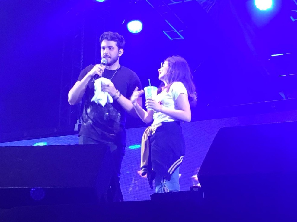 Nayara subiu ao palco e ficou "coladinha" com o ídolo Gustavo Mioto na Festa Junina de Votorantim — Foto: Natália de Oliveira/G1