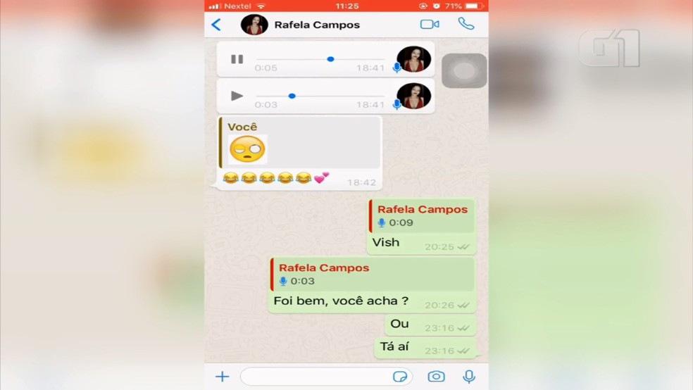 Rafaela enviou um áudio à amiga às 18h41, logo após sair do local da prova. A amiga respondeu às 20h25 e o recado não foi mais visualizado pela vítima, assim como as outras mensagens na sequência. (Veja abaixo)