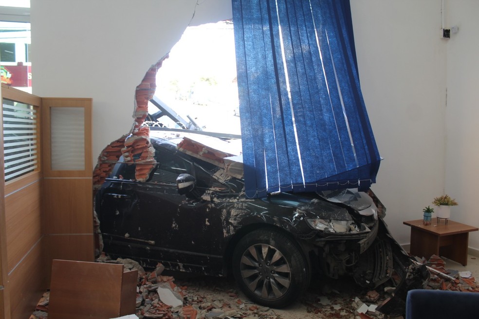 Carro destruiu a parede do escritório de contabilidade após ser empurrado por outro veículo na avenida São João, em Votorantim (SP). Thaís Machado estava em horário de almoço no momento que veículo invadiu local; vídeo registrou acidente.