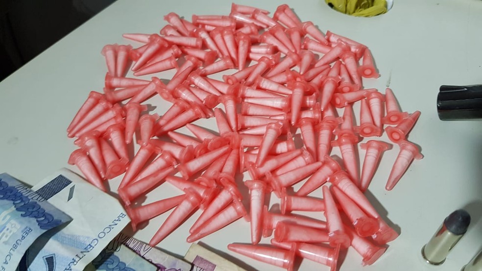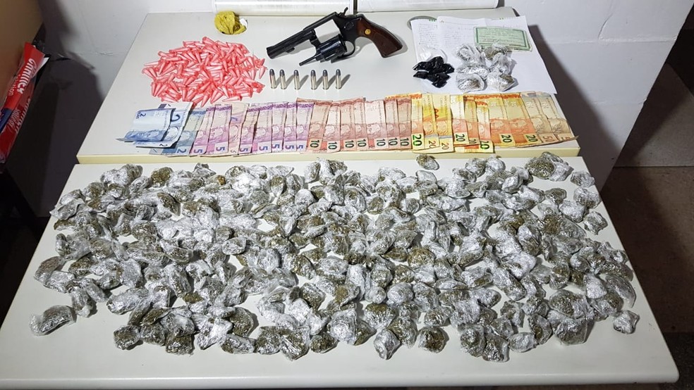Na casa do suspeito, a PM encontrou 286 porções de maconha, 128 pinos de cocaína, uma arma calibre 38 e seis munições. Ele e uma jovem de 18 anos foram detidos.