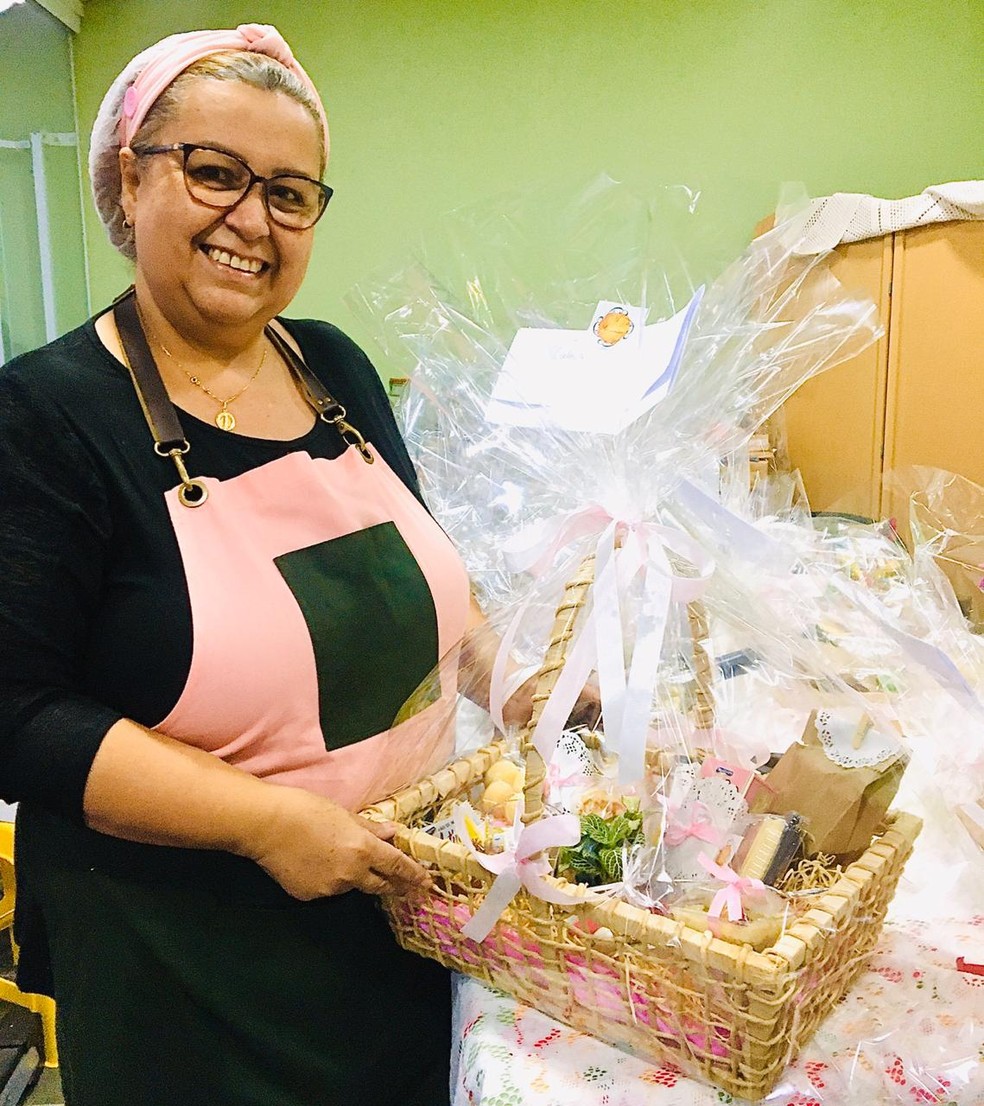 Disponível para entrega em Sorocaba e Votorantim (SP), a cesta pode ser personalizada, mas traz os seguintes itens fixos: lanchinhos de pernil, canjica, maçã do amor, mix de doces juninos, bolo de cenoura, amendoim, pipoca, pinhão, vinho quente e quentão. A maioria dos quitutes é produzida pela própria Nelci.