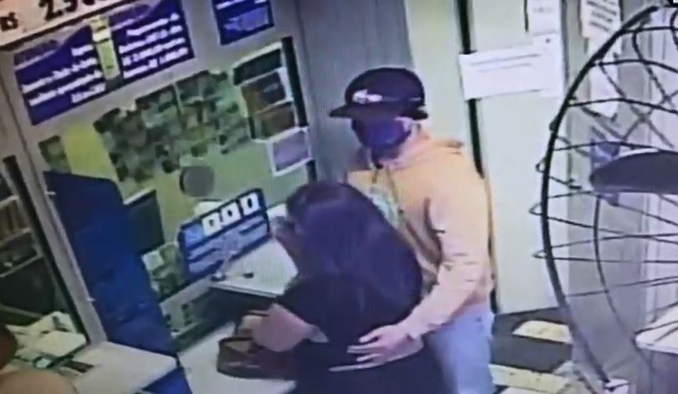 Nas imagens, é possível ver uma mulher entrando na parte administrativa do estabelecimento, quando é rendida por um dos ladrões e chega a ser empurrada. Em seguida, o comparsa aparece e rende uma cliente (veja abaixo). Os dois estavam de máscaras de proteção.