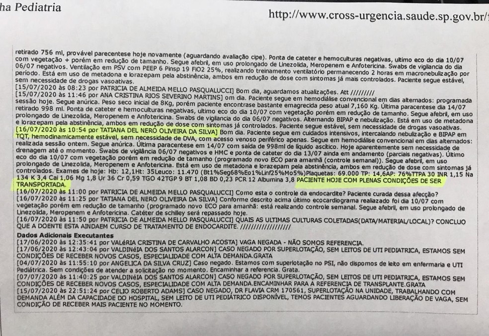 A direção do hospital GPACI disse que entrou em contato com a Secretaria de Saúde do Estado novamente e enviou ao G1 uma cópia do prontuário da criança, que foi atualizado nesta quinta-feira (16), e informa que ela se encontra em "plenas condições de ser transportada" (veja abaixo).