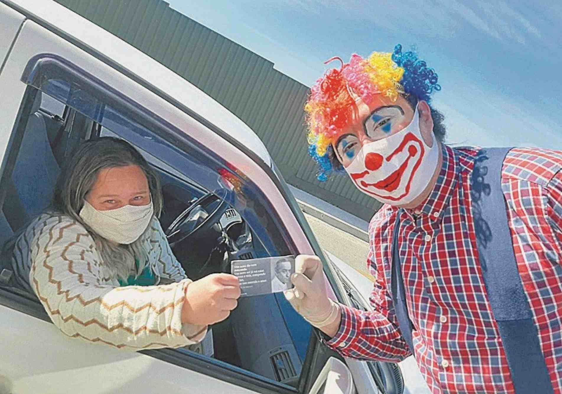 INTEGRANTE DO GRUPO, FANTASIADO, ENTREGA POESIA NA FILA DA VACINAÇÃO EM VOTORANTIM (CRÉDITO: DIVULGAÇÃO)