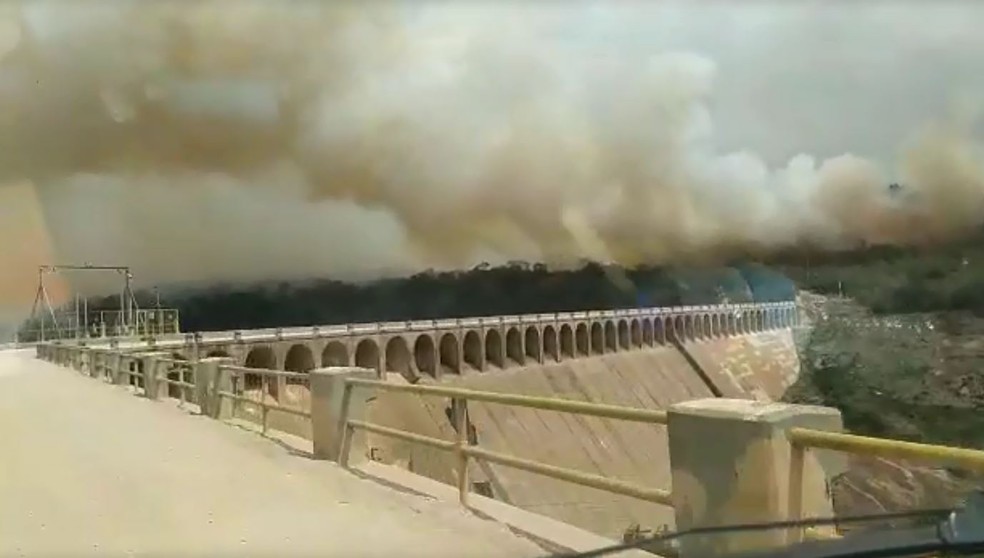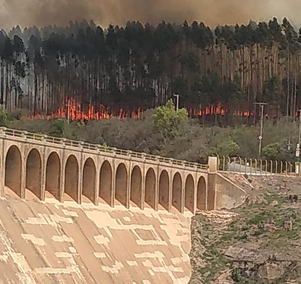 Uma queimada atingiu uma plantação de eucaliptos que fica perto da barragem da Represa de Itupararanga, em Votorantim (SP), nesta terça-feira (14).