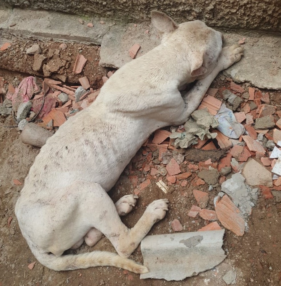 O cachorro, da raça pitbull, foi encontrado debilitado, com respiração fraca e inúmeros carrapatos pelo corpo. Também estava sem água na vasilha e ração dentro de um saco plástico. Além disso, foi constatado de que o local estava totalmente insalubre, com mau cheiro e descoberto.