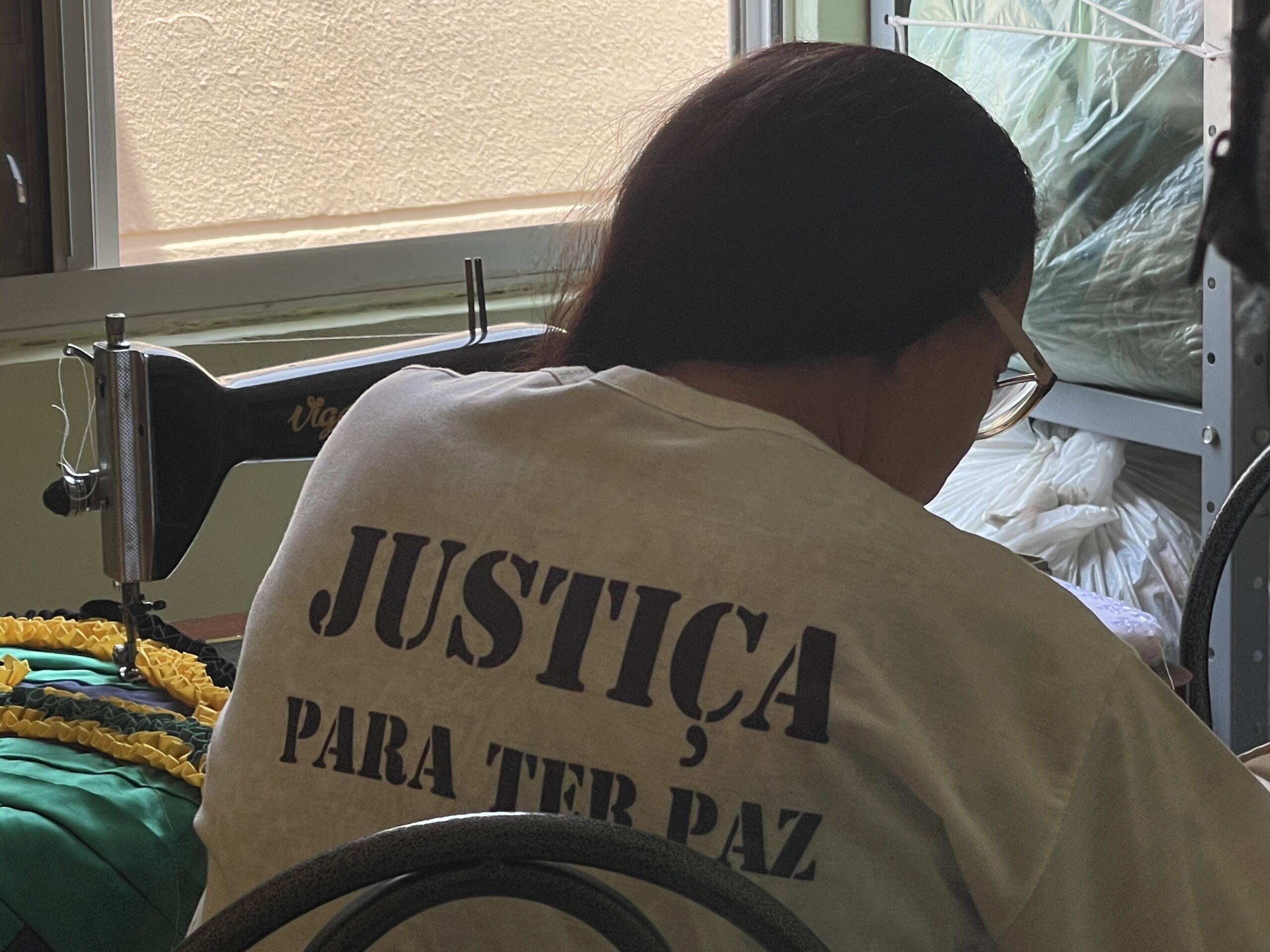 "Justiça para ter paz": Maria do Carmo em sua máquina de costura usando a camiseta que fez em homenagem ao filho Elvis — Foto: Júlia Martins/g1