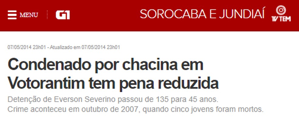 Matéria do g1 de 2007 sobre a redução da pena de Everson "Maninho" — Foto: Reprodução